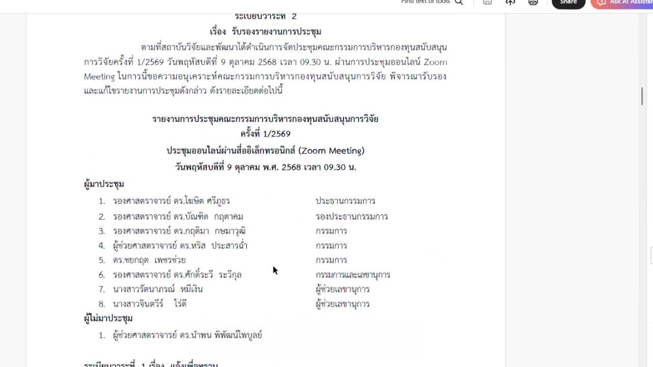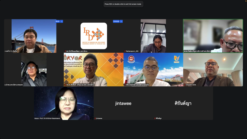 วันพฤหัสบดีที่ 6 พฤศจิกายน 2568 สถาบันวิจัยและพัฒนา มทร.อีสาน จัดการประชุมคณะกรรมการบริหารกองทุนสนับสนุนการวิจัย ครั้งที่ 2/2569 ผ่านสื่ออิเล็กทรอนิกส์(Zoom Meeting) โดยมี รศ.ดร.โฆษิต ศรีภูธร อธิการบดีมหาวิทยาลัยเทคโนโลยีราชมงคลอีสาน เป็นประธานการประชุม ในการนี้ รศ.ดร.บัณฑิต กฤตาคม รองอธิการบดีฝ่ายวิจัย